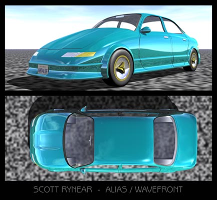 Alias CarThis custom 3D car model was produced in Alias v8 on an SGI Indigo/IRIX workstation at Arts Center College of Design in 1997. Six lights, environment generator, custom shaders, ray tracing, network rendering, bi-rails, squares, fillets, booleans, revolves, rail extrudes and projections. Tough to keep everything smooth! Oh yeah, vanity license plate. |